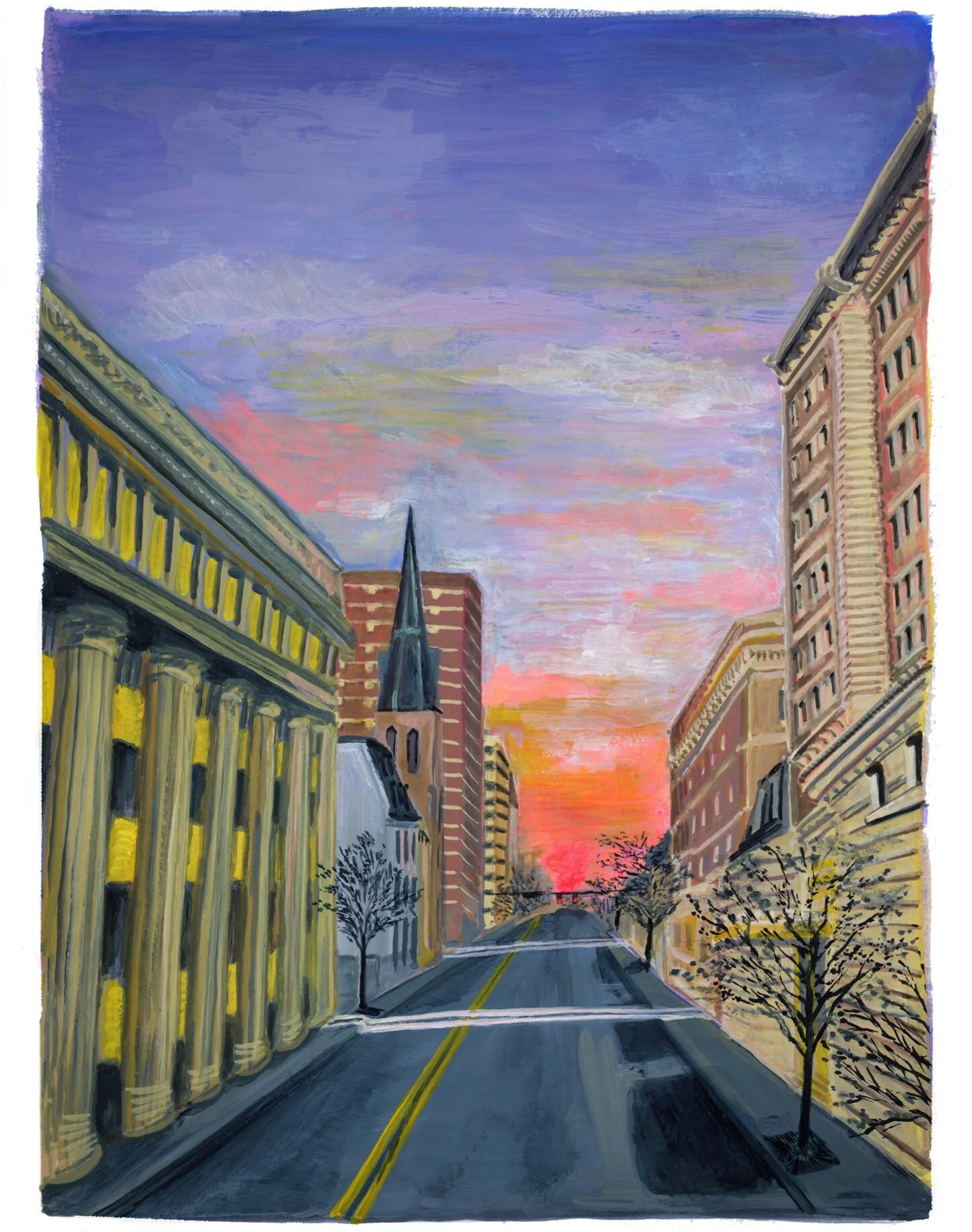 Eerily quiet street at sunset; Mt. Vernon, Baltimore, MD.