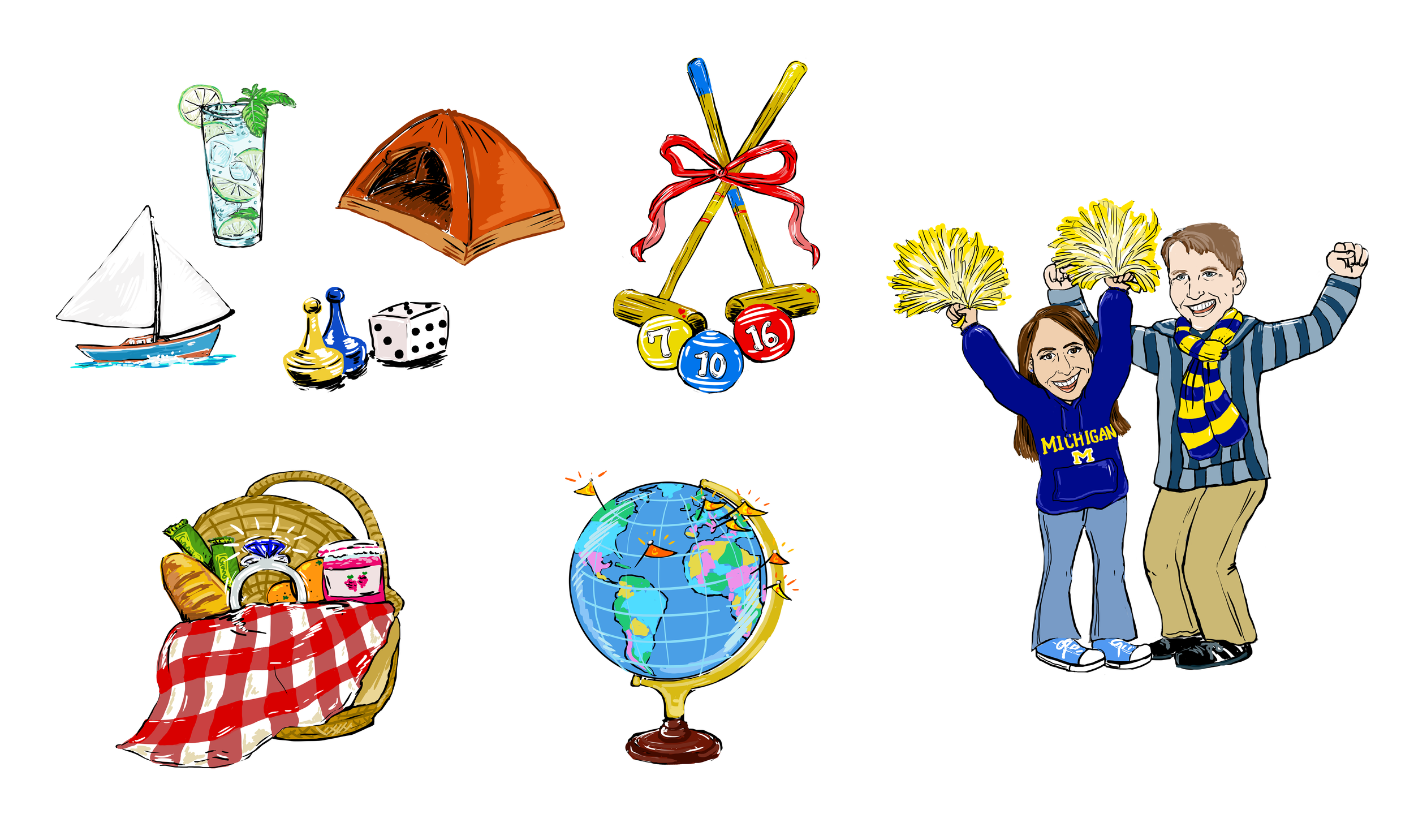 Claire & Colin met at the University of Michigan, and had an afternoon park wedding in July 2016. They wanted playful illustrations to reflect their fun, laid-back personalities and their love of lawn games and the outdoors. I created several images for them to sprinkle throughout their website, including a globe reflecting the countries they have traveled to (separately and together), and a picnic basket not unlike the one they packed on the afternoon of their engagement.