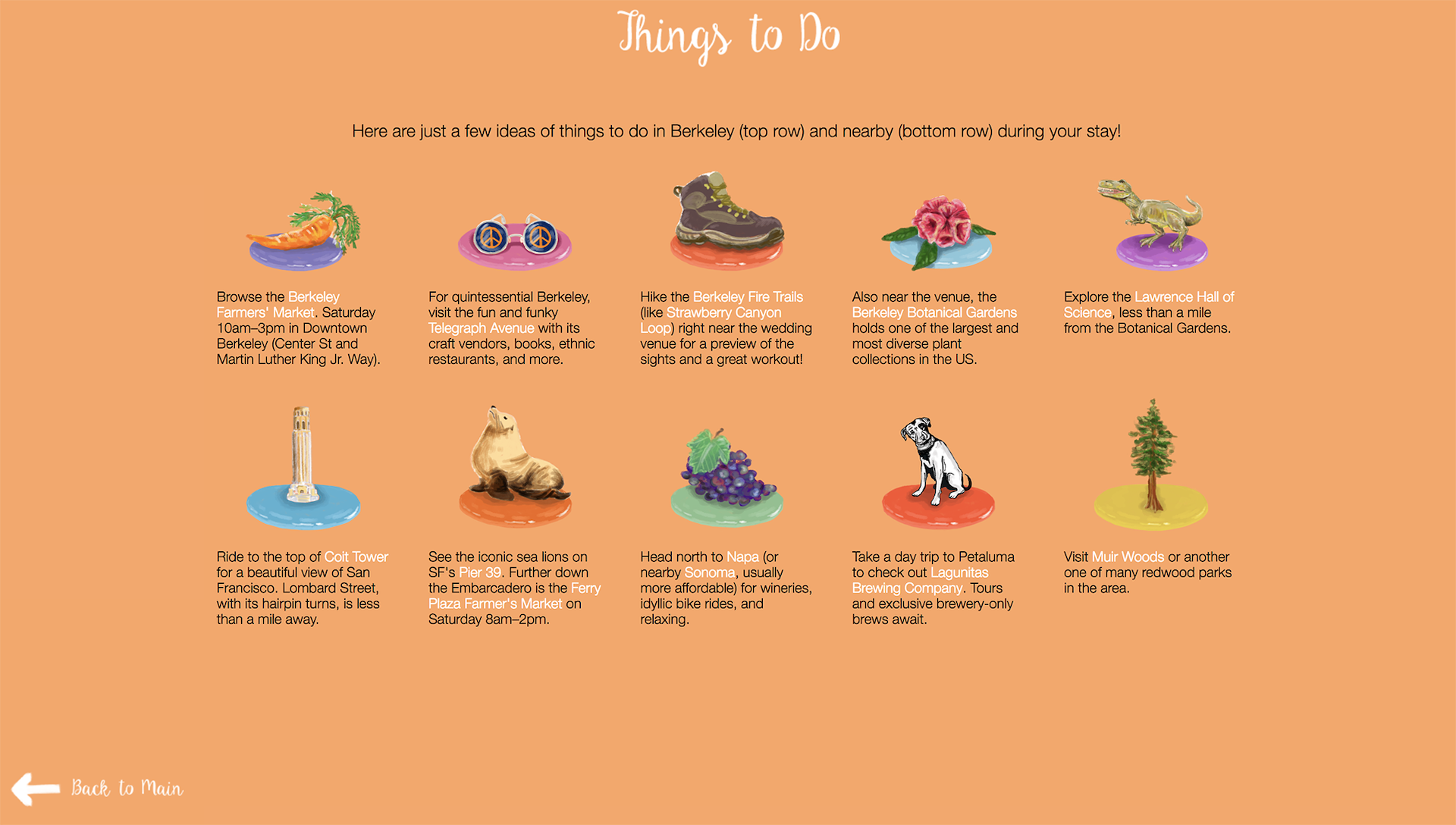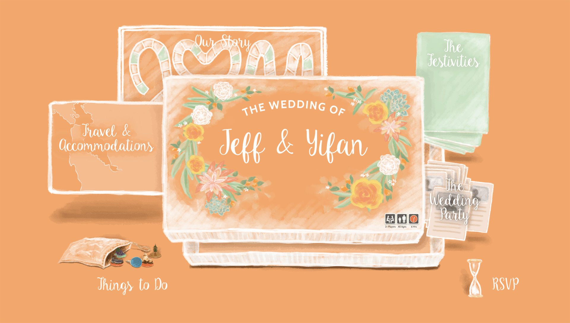 My husband and I designed our interactive wedding website from scratch, modeled like a board game. The game board illustrated our love story; the game rules featured wedding weekend logistics; the game pieces represented attractions for guests; the timer led to the RSVP link; the player description cards featured our wedding party bios; and the map provided guests with travel and accommodation logistics.